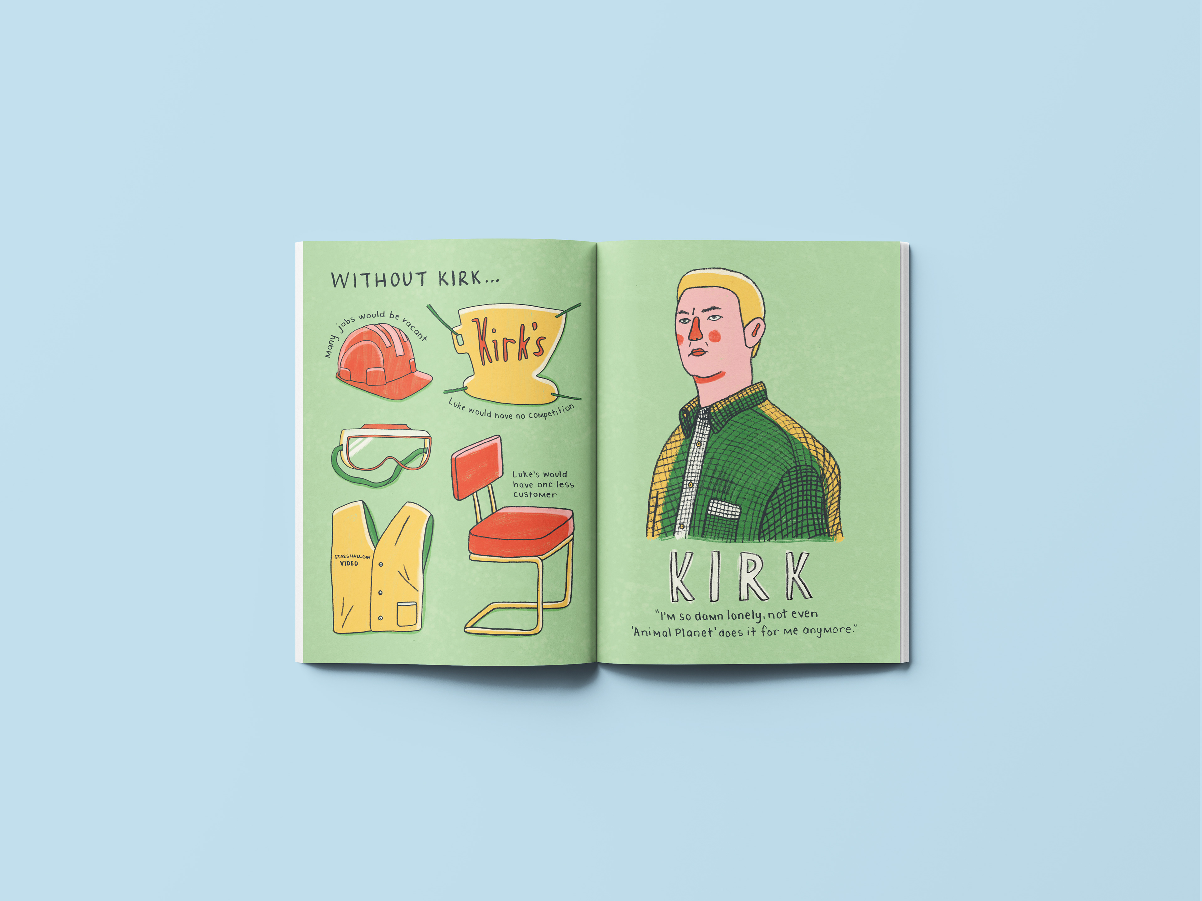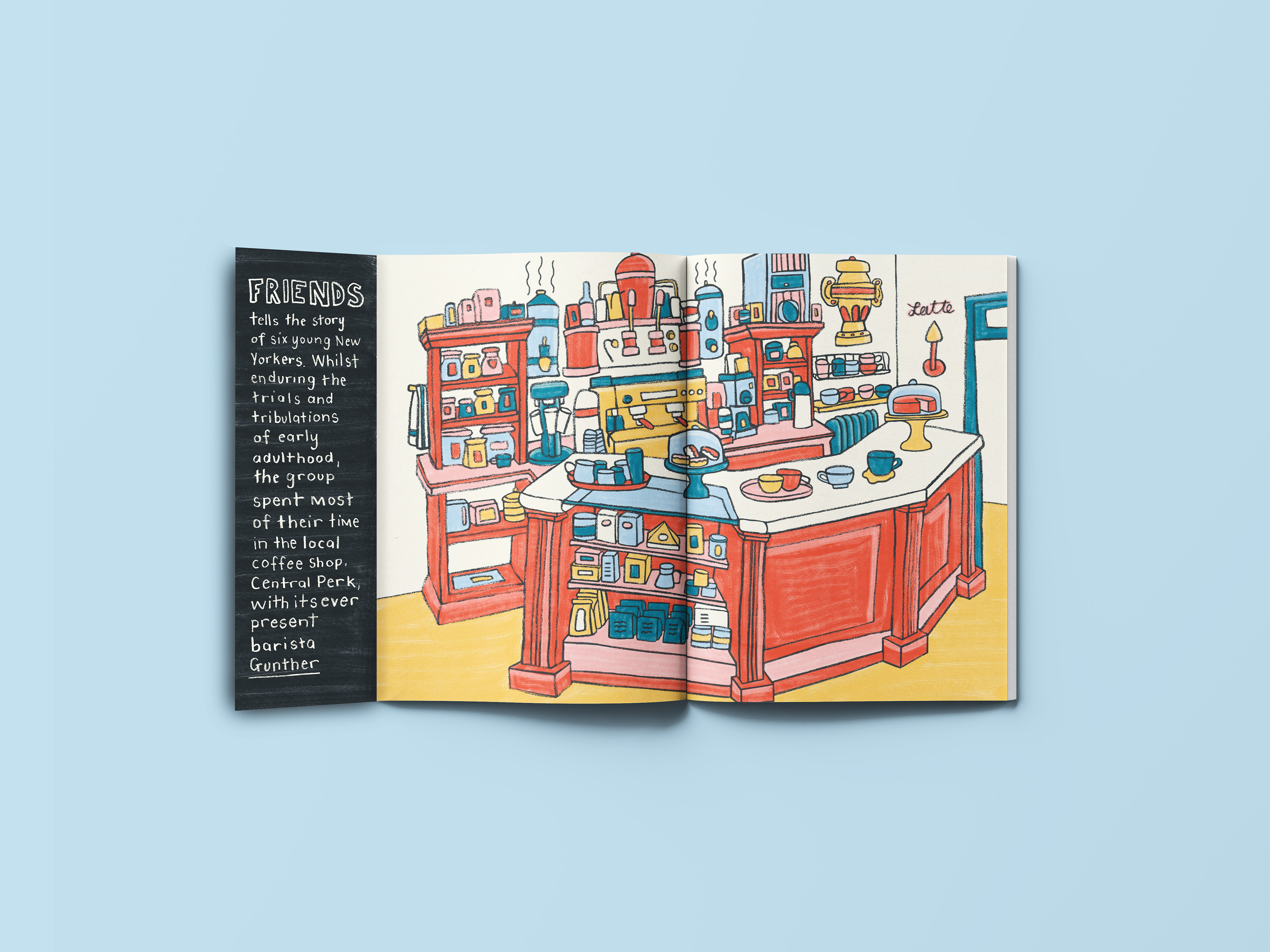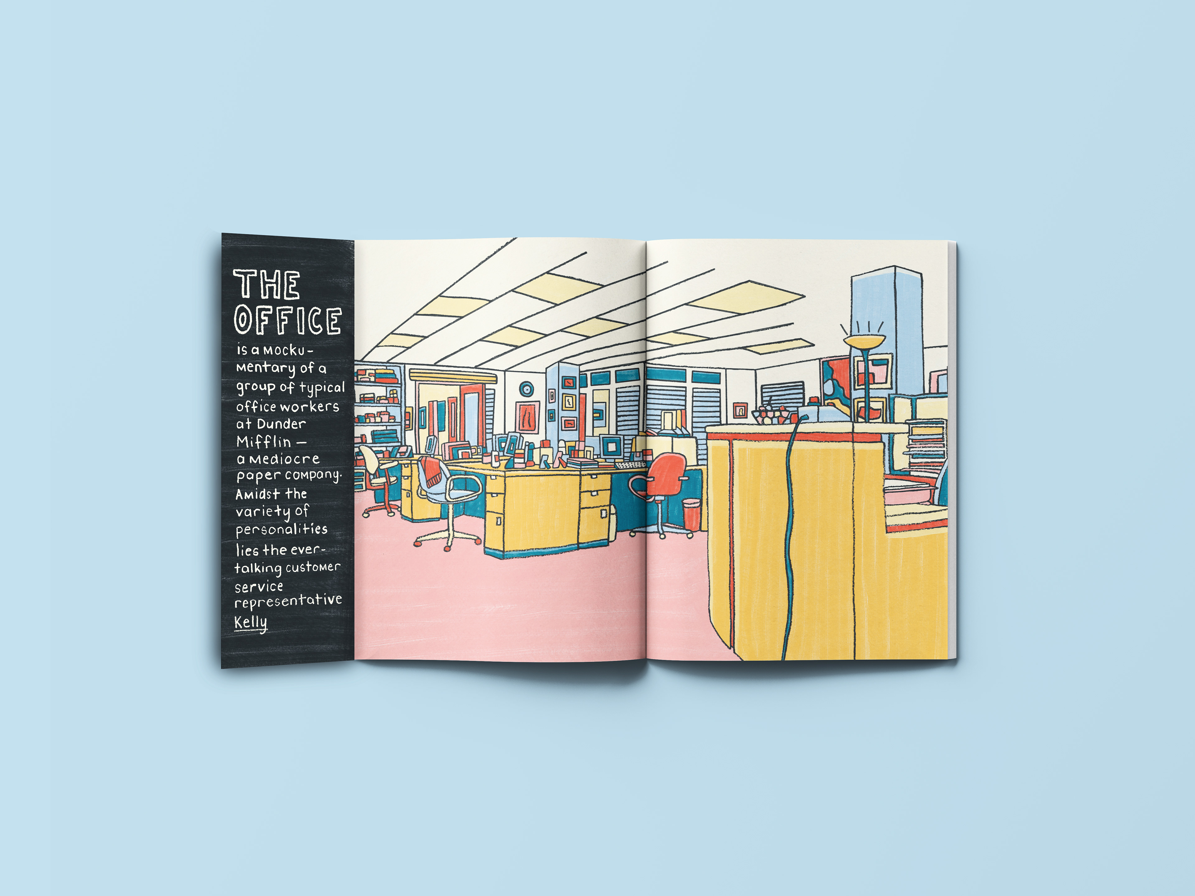 I was tasked with creating an illustrated zine featuring four profiles, four object pages, and four environment illustrations. Working within the theme “Places I’ve Never Been To and People I’ve Never Met,” I developed my own concept and content titled Sitcom Sidekicks. The zine explores the often-overlooked supporting characters from beloved television sitcoms, highlighting their importance in shaping storylines and supporting the main cast. Using a hand-drawn illustration style, I aimed to evoke a sense of comfort and familiarity — mirroring the warmth and nostalgia we feel when watching our favourite sitcoms.